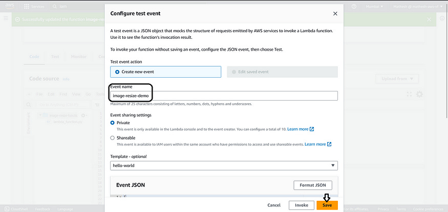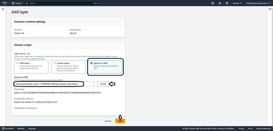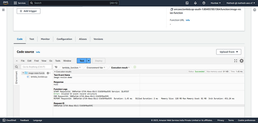 arn:aws:lambda:ap-south-1:770693421928:layer:Klayers-p39-pillow:1After doing all the actions above, now we can finally test our code.